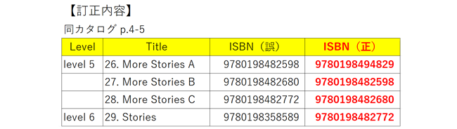 今年度発行いたしました「オックスフォード・リーディング・ツリー&児童向け書籍カタログ2026年度版」に記載されている一部商品のISBNに誤りがございました。正しくは以下の通りです。皆様にはご迷惑をおかけしましたことを、心よりお詫び申し上げます。