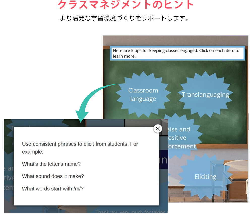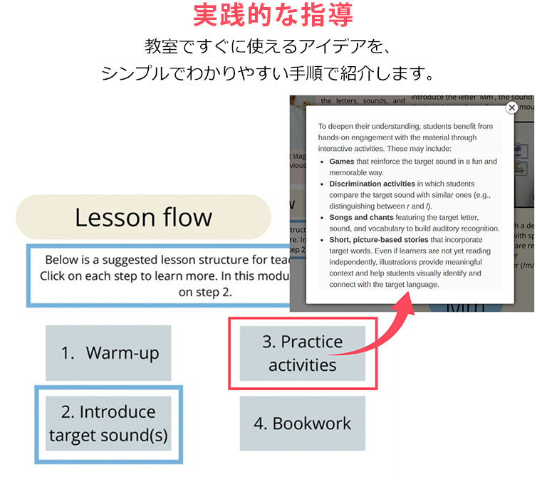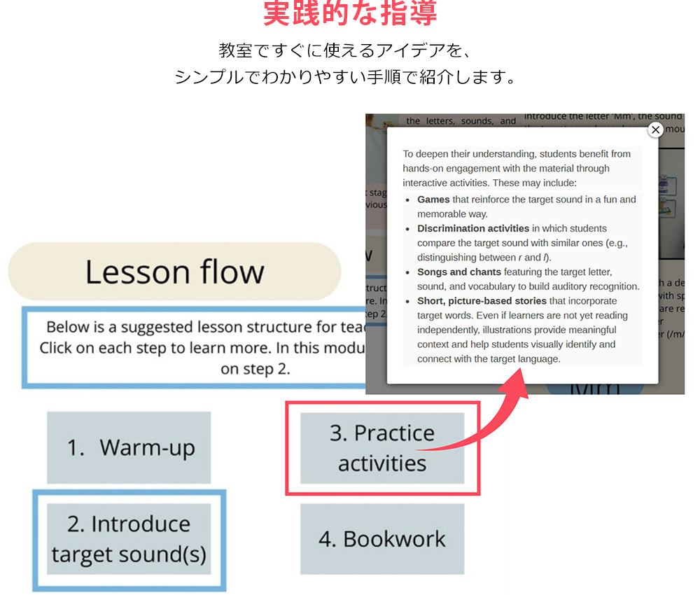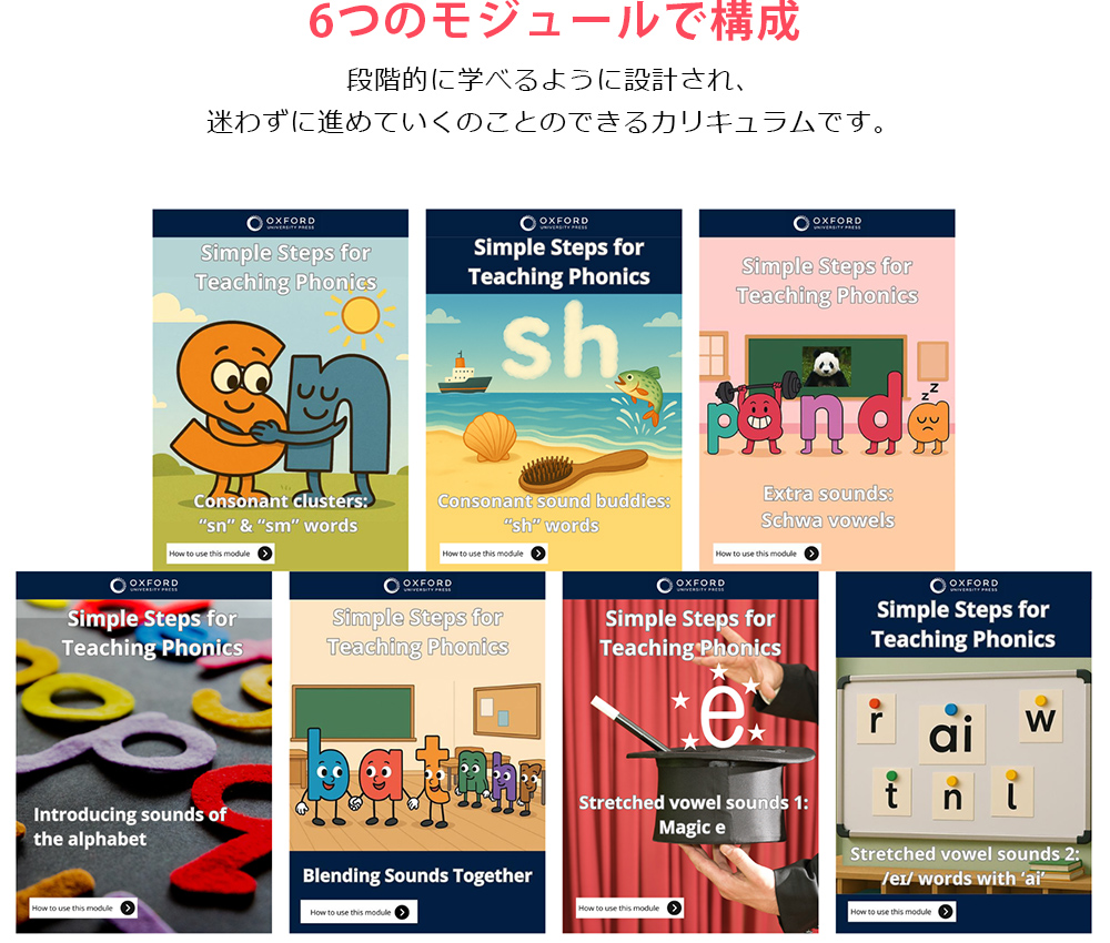このオンライントレーニングコースでは、児童にフォニックスを教えるための実践的な指導法を、「シンプルなステップ」でわかりやすく解説します。基礎的な読み書きのスキルはあるものの、英語を学ぶ機会が限られている子どもたちを教える先生に理想的な内容です。コースはシンプルにまとめられたモジュールで構成されており、動画によるデモンストレーションやクラスマネジメントのヒントも紹介します。フォニックスの指導が初めての先生にも、フォニックスをあらためて学びたい先生にも最適な教材です。
